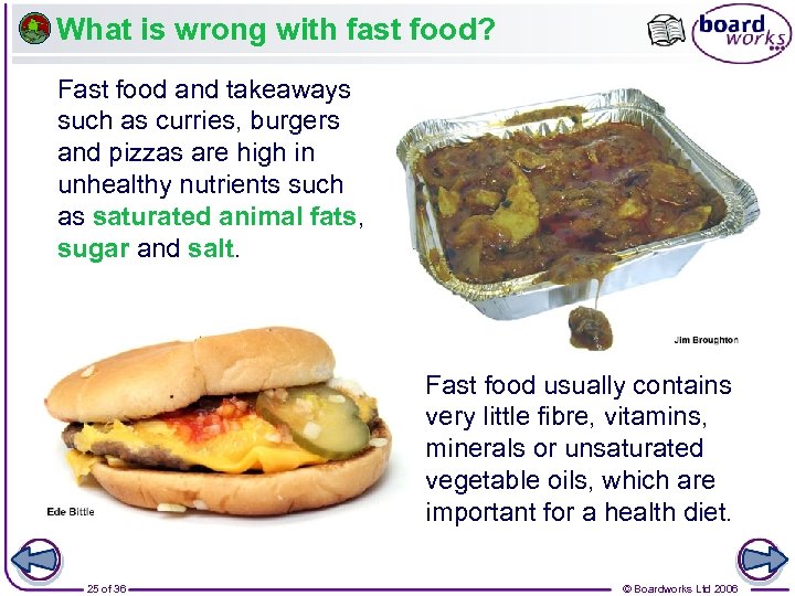 What is wrong with fast food? Fast food and takeaways such as curries, burgers and pizzas are high in unhealthy nutrients such as saturated animal fats, sugar and salt. Fast food usually contains very little fibre, vitamins, minerals or unsaturated vegetable oils, which are important for a health diet. 25 of 36 © Boardworks Ltd 2006