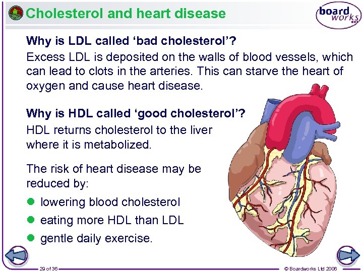 Cholesterol and heart disease Why is LDL called ‘bad cholesterol’? Excess LDL is deposited on the walls of blood vessels, which can lead to clots in the arteries. This can starve the heart of oxygen and cause heart disease. Why is HDL called ‘good cholesterol’? HDL returns cholesterol to the liver where it is metabolized. The risk of heart disease may be reduced by: l lowering blood cholesterol l eating more HDL than LDL l gentle daily exercise. 29 of 36 © Boardworks Ltd 2006