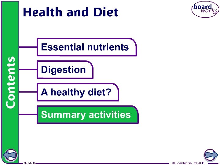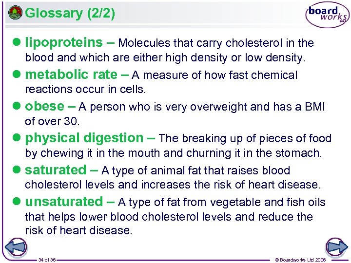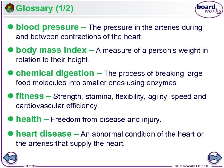 Glossary (1/2) l blood pressure – The pressure in the arteries during and between contractions of the heart. l body mass index – A measure of a person’s weight in relation to their height. l chemical digestion – The process of breaking large food molecules into smaller ones using enzymes. l fitness – Strength, stamina, flexibility, agility, speed and cardiovascular efficiency. l health – Freedom from disease and injury. l heart disease – An abnormal condition of the heart or the arteries that supply the heart. 33 of 36 © Boardworks Ltd 2006