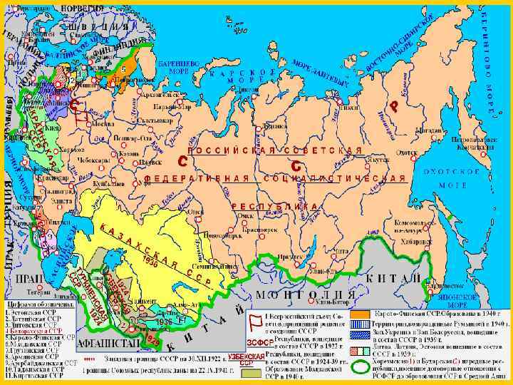 ИЗМЕНЕНИЯ В СОСТАВЕ СССР 1922 г. – РСФСР, УССР, БССР, ЗССР 1925 г. – Узбекистан и Туркменистан 1929 г. – Таджикистан 1936 г. – была распущена ЗСФСР и Армения, Грузия, Азербайджан вошли непосредственно в состав СССР