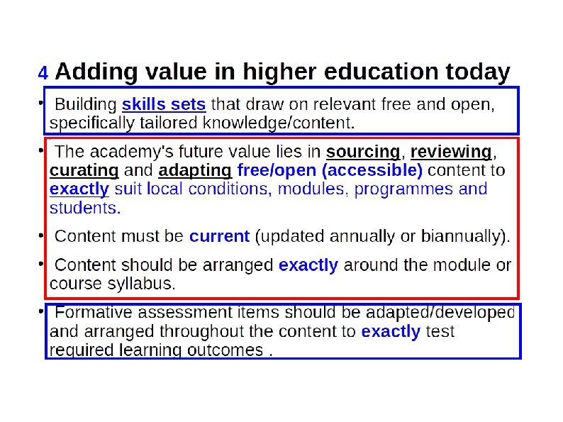 3 How are universities adapting to open content? We are not. We: Still think our main job is to sell knowledge in 50 minute chunks (lectures) mined from commercial textbooks. Require students to purchase proprietary textbooks which are not exactly tailored to our courses. Are often not aware of the cost of textbooks we prescribe. Often significant portions of the prescribed textbooks are not used (wastage). Are unaware/unconcerned about how many students purchase the textbook, are unaware of the extent of copyright violations.