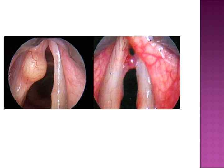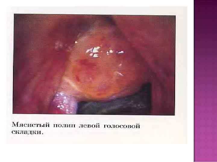 Полипы голосовых складок. Как правило, встречаются у взрослых. Наиболее частая причина возникновения болезни — курение. Симптоматика. Жалобы на охриплость (голос грубый, дребезжащий). При ларингоскопии — полипы, как правило, двусторонние, располагаются по свободному краю голосовых складок (от передней комиссуры до голосовых отростков черпаловидных хрящей). На голосовые отростки полипы не распространяются. Диагностика осуществляется на основании жалоб больного и ларингоскопической картины. Лечение. Микрохирургическое вмешательство с последующими фониатрическими мероприятиями дает хороший функциональный результат.