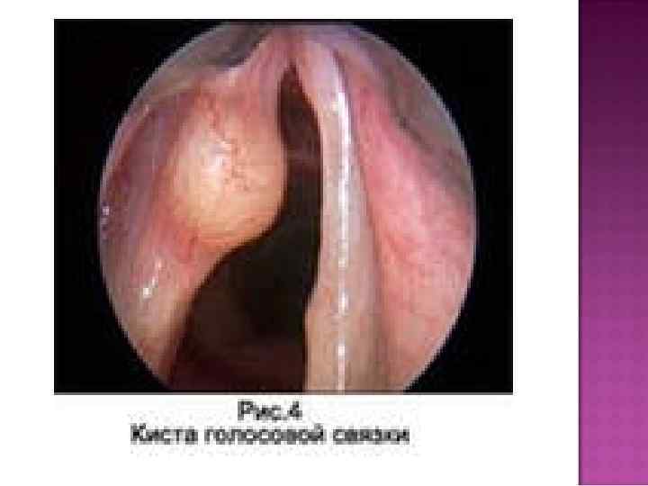Кисты гортани. Чаще встречаются ретенционные кисты. Они могут локализоваться на язычной (или гортанной) поверхности надгортанника, в области вестибулярных (преддверных) и голосовых складок. На язычной поверхности надгортанника киста может достигать больших размеров и занимать всю поверхность надгортанника. Кисты вестибулярных складок представляют собой гладкую, полушаровидную или несколько вытянутую припухлость на верхней поверхности или по краю вестибулярной складки. При поверхностном расположении кисты просвечивается ее содержимое, при глубоком — над ней имеется лишь равномерная припухлость слизистой оболочки. В зависимости от размеров и локализации киста может прикрывать часть или всю голосовую складку, большую или меньшую часть голосовой щели. Киста, исходящая из слизистой оболочки гортанного желудочка, в виде мешочка как бы лежит на голосовой складке. Кисты голосовых складок обычно располагаются подэпителиально в их переднесреднем отделе. Они односторонни и имеют вид небольших округлых образований на верхней поверхности складки. ).