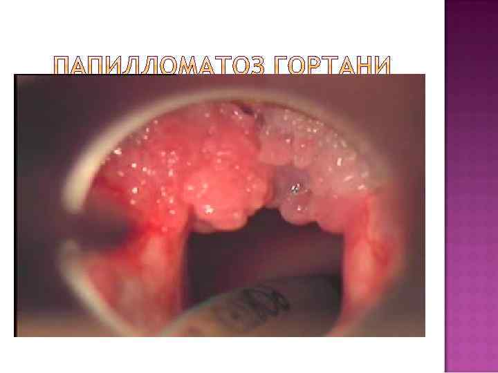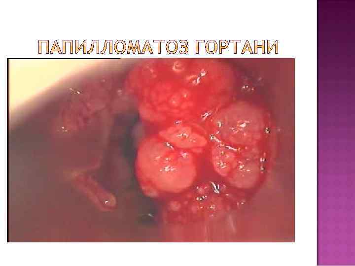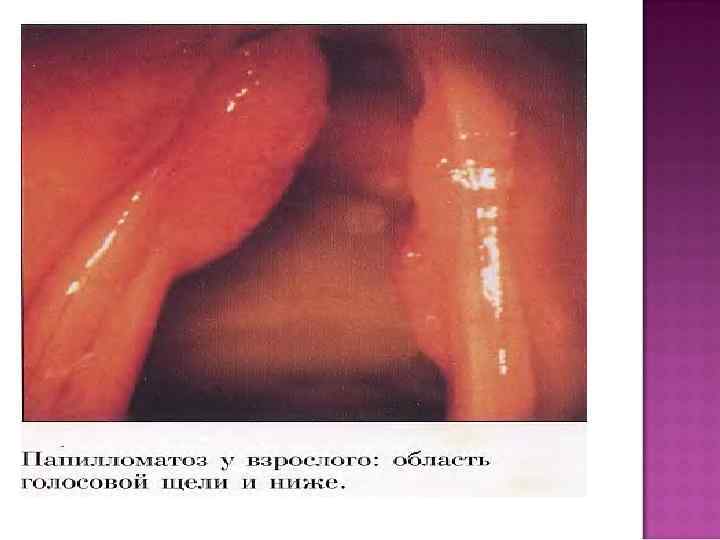 Симптоматика. Охриплость, которая постепенно переходит в афонию. При разрастании папиллом развивается прогрессирующий стеноз гортани. При ларингоскопии (и микроларингоскопии) — характерный внешний вид: неровная мелкозернистая (напоминающая тутовую ягоду) или мелкодольчатая (напоминающая цветную капусту) поверхность опухоли. Цвет папиллом бледно-розовый с сероватым оттенком. Консистенция их мягкая, рыхлая. Они легко кровоточат при дотрагивании. Диагноз устанавливают на основании клинической картины и данных ларингоскопии. Лечение. Основной метод — повторные хирургические вмешательства (через рот или после раскрытия гортани — ларингостомии). Несмотря на множество предложенных способов (местное применение подофиллина, проспедина, криовоздействие, иммунотерапия, микрохирургия) достаточно эффективный метод лечения пока не найден. Несколько обнадеживающим является использование лазерного луча. Эндоларингеальная микрохирургия позволила значительно уменьшить число трахеостомии, продлить периоды ремиссии, уменьшить число канюленосителей.