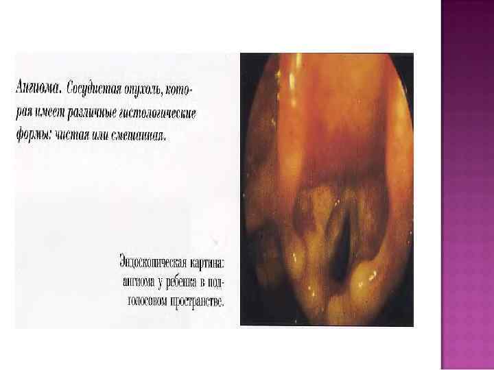 Ангиома растет медленно, обычно бывает единичная, небольших размеров. Цвет гемангиомы синюшный или красный, лимфангиома имеет бледно-желтую окраску. Симптоматика: При локализации в верхнем отделе гортани беспокоит ощущение инородного тела, иногда покашливание. Постепенно, в течении нескольких лет, симптоматика нарастает: появляется охриплость, болезненность, а затем и примесь крови в мокроте. Если опухоль исходит из голосовой складки, то первым симптомом является изменение голоса от незначительной слабости до афонии. Лечение: хирургическое.