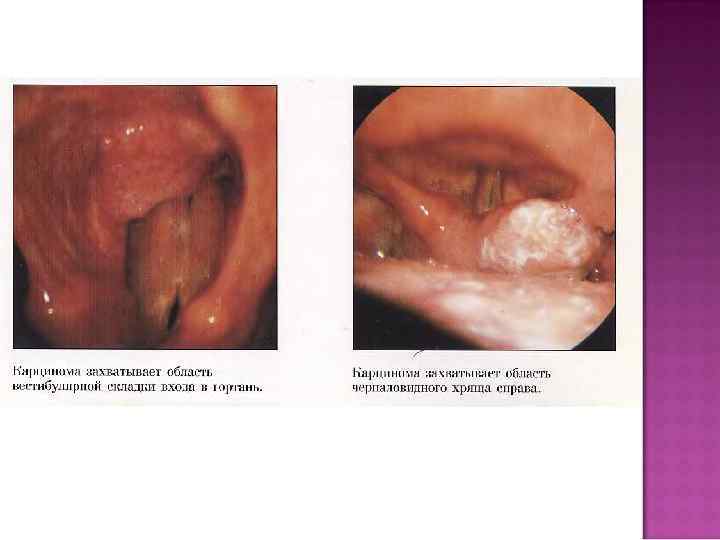 Основным ларингоскопическим признаком рака гортани является наличие на стенках ее опухоли. Характерна бугристая опухоль, но при эндофитном росте слизистая оболочка может быть гладкой и неизмененной, лишь иньецированность ее сосудами иноггда бывает признаком злокачественного процесса. В более поздней стадии на поверхности опухоли могут быть видны блюдцеобразные углубления, иногда покрытые белесоватым налетом- это распад опухоли в виде изьявлений.