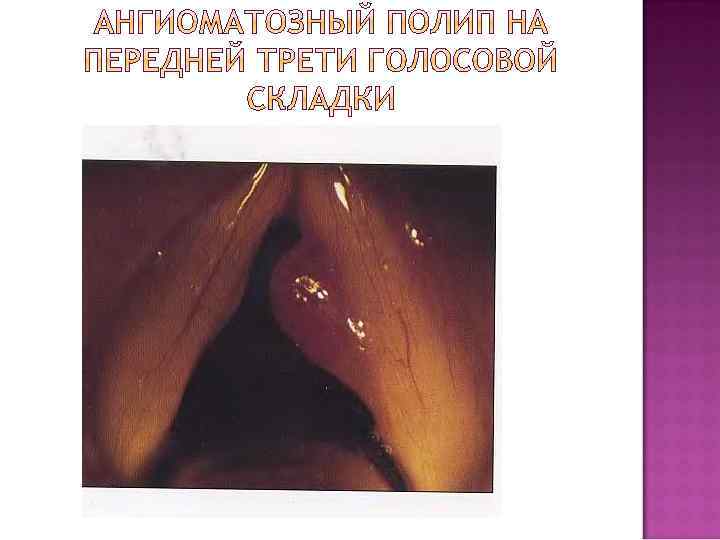 Ангиома- доброкачественная сосудистая опухоль гортани, формирующаяся из расширенных кровеносных ( гемангиомы ) или лимфатических ( лимфангиомы ) сосудов, локализующаяся на поверхности голосовых, вестибулярных или черпалонадгортанных складках