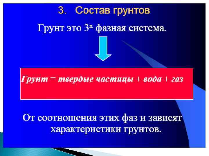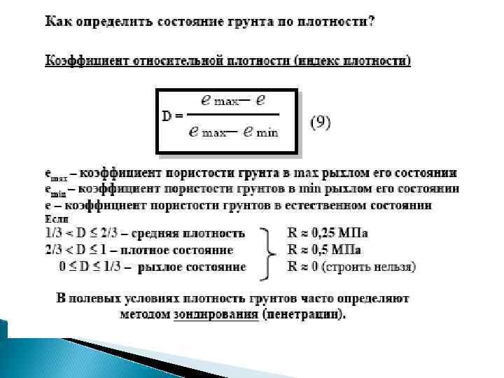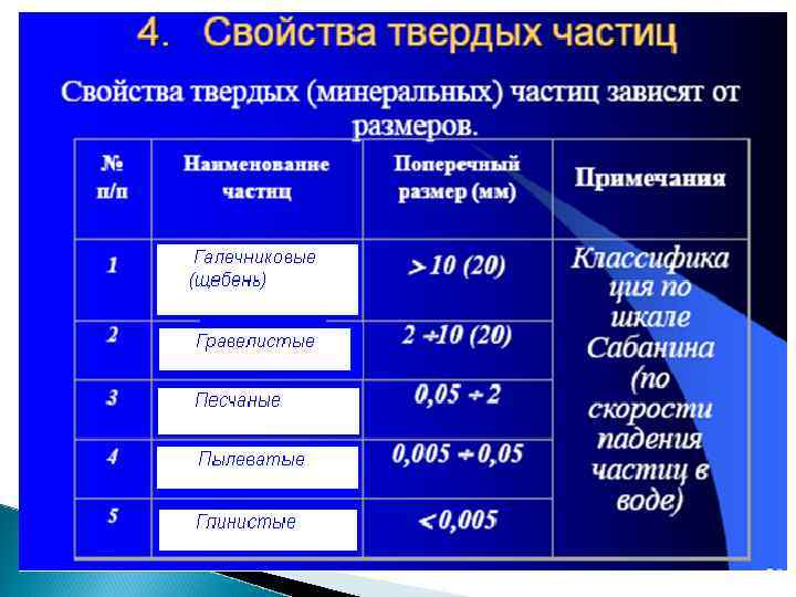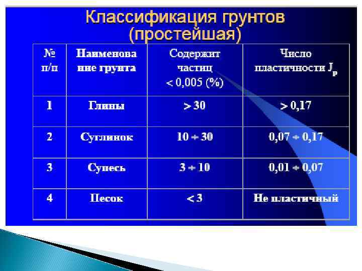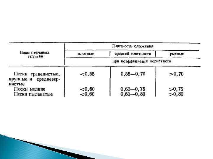 Разновидность грунтов Размер зерен, частиц , мм Содержание зерен, частиц, % по массе валунный (при преобладании неокатанных частиц - глыбовый) > 200 > 50 - галечниковый (при гранях - щебенистый) неокатанных > 10 > 50 - гравийный (при неокатанных гранях дресвяный) >2 > 50 >2 > 0, 50 > 0, 25 > 0, 10 > 25 > 50 75 < 75 Крупнообломочные: Пески: - гравелистый - крупный - средней крупности - мелкий - пылеватый