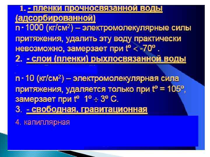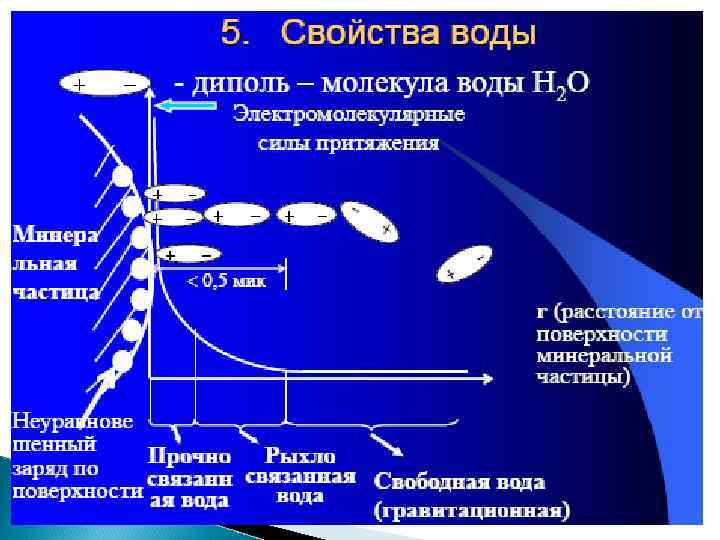 Твердые минеральные частицы Свойства твердых частиц зависят также от минералогического состава: различные минералы имеют разную удельную поверхность – площадь поверхности 1 г или 1 см 3 частиц, – определяющую поверхностную активность частиц в процессе их взаимодействия с водой. Чем мельче частицы, тем больше их удельная поверхность и, следовательно, поверхностная активность: Монтмориллонит – 800 м 2/г; Каолин – 10 м 2/г; Кварц, полевой шпат – менее 1 м 2/г.