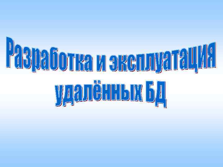 Удаленная база данных Удалённая БД размещается на компьютере – сервере сети, а приложение, осуществляющее работу с этой БД, находится на компьютере пользователя. Программа работы с удаленной БД состоит из двух частей: клиентской и серверной.