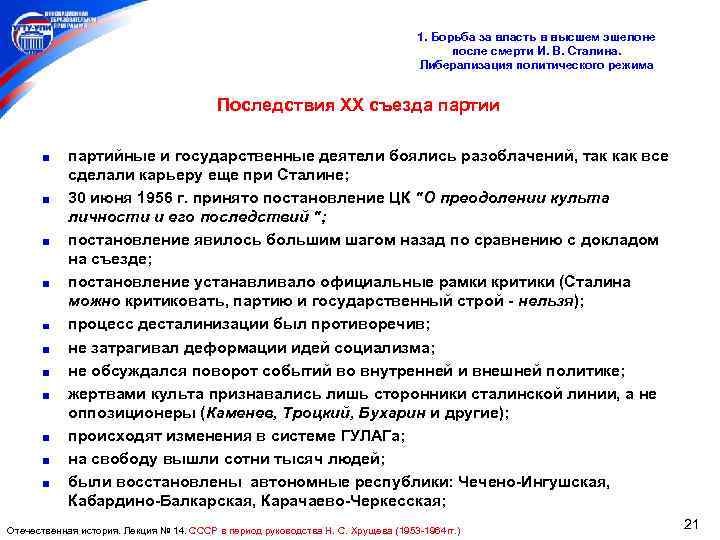 1. Борьба за власть в высшем эшелоне после смерти И. В. Сталина. Либерализация политического режима Последствия XX съезда партии партийные и государственные деятели боялись разоблачений, так как все сделали карьеру еще при Сталине; 30 июня 1956 г. принято постановление ЦК "О преодолении культа личности и его последствий "; постановление явилось большим шагом назад по сравнению с докладом на съезде; постановление устанавливало официальные рамки критики (Сталина можно критиковать, партию и государственный строй нельзя); процесс десталинизации был противоречив; не затрагивал деформации идей социализма; не обсуждался поворот событий во внутренней и внешней политике; жертвами культа признавались лишь сторонники сталинской линии, а не оппозиционеры (Каменев, Троцкий, Бухарин и другие); происходят изменения в системе ГУЛАГа; на свободу вышли сотни тысяч людей; были восстановлены автономные республики: Чечено Ингушская, Кабардино Балкарская, Карачаево Черкесская; Отечественная история. Лекция № 14. СССР в период руководства Н. С. Хрущева (1953 1964 гг. ) 21