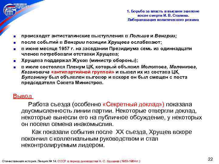 1. Борьба за власть в высшем эшелоне после смерти И. В. Сталина. Либерализация политического режима происходят антисталинские выступления в Польше и Венгрии; после событий в Венгрии позиции Хрущева ослабевают; в июне месяце 1957 г. на заседании Президиума семь из одиннадцати членов потребовали отставки Хрущева; Хрущева поддержал Жуков (министр обороны); в июле состоялся Пленум ЦК, который объявил Молотова, Маленкова, Кагановича «антипартийной группой» и вывел их из состава ЦК, Булганину был объявлен выговор и вскоре он был смещен с поста председателя Совета Министров. Вывод Работа съезда (особенно «Секретный доклад» ) показала двусмысленность линии партии. Некоторые отвергли доклад, некоторые вынесли его на публичное обсуждение, у некоторых он посеял семена инакомыслия. Как показали события после XX съезда, Хрущев вскоре покончил с коллегиальным руководством и стал неконтролируемым лидером. Отечественная история. Лекция № 14. СССР в период руководства Н. С. Хрущева (1953 1964 гг. ) 22