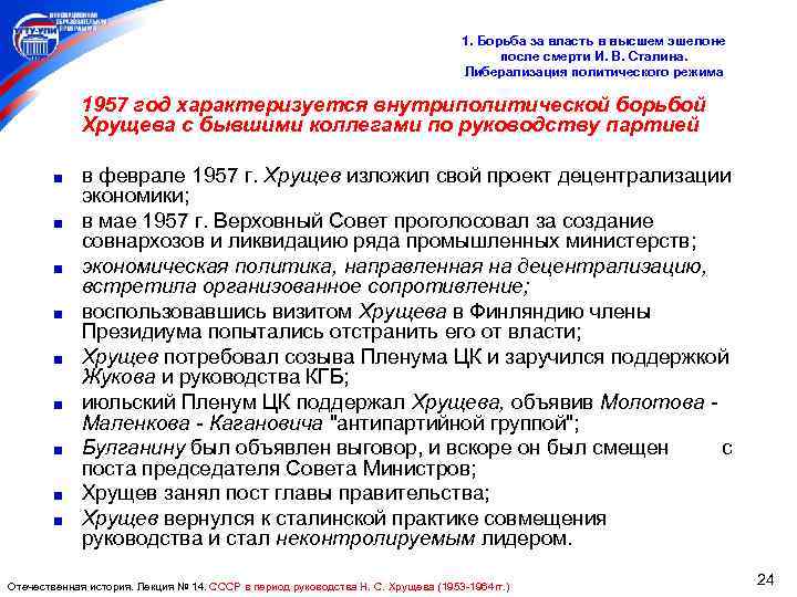 1. Борьба за власть в высшем эшелоне после смерти И. В. Сталина. Либерализация политического режима 1957 год характеризуется внутриполитической борьбой Хрущева с бывшими коллегами по руководству партией в феврале 1957 г. Хрущев изложил свой проект децентрализации экономики; в мае 1957 г. Верховный Совет проголосовал за создание совнархозов и ликвидацию ряда промышленных министерств; экономическая политика, направленная на децентрализацию, встретила организованное сопротивление; воспользовавшись визитом Хрущева в Финляндию члены Президиума попытались отстранить его от власти; Хрущев потребовал созыва Пленума ЦК и заручился поддержкой Жукова и руководства КГБ; июльский Пленум ЦК поддержал Хрущева, объявив Молотова Маленкова Кагановича "антипартийной группой"; Булганину был объявлен выговор, и вскоре он был смещен с поста председателя Совета Министров; Хрущев занял пост главы правительства; Хрущев вернулся к сталинской практике совмещения руководства и стал неконтролируемым лидером. Отечественная история. Лекция № 14. СССР в период руководства Н. С. Хрущева (1953 1964 гг. ) 24