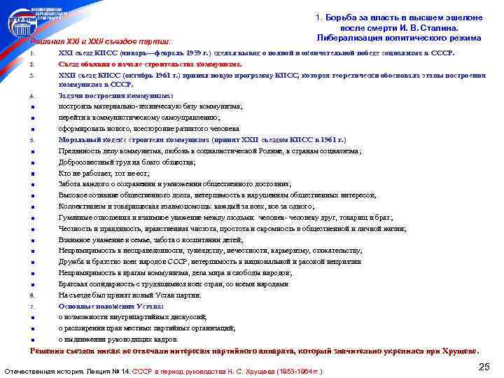 1. Борьба за власть в высшем эшелоне после смерти И. В. Сталина. Либерализация политического режима Решения XXI и XXII съездов партии: 1. XXI съезд КПСС (январь—февраль 1959 г. ) сделал вывод о полной и окончательной победе социализма в CCCР. 2. Съезд объявил о начале строительства коммунизма. 3. ХХII съезд КПСС (октябрь 1961 г. ) принял новую программу КПСС, которая теоретически обосновала этапы построения коммунизма в СССР. 4. Задачи построения коммунизма: построить материально-техническую базу коммунизма; перейти к коммунистическому самоуправлению; сформировать нового, всесторонне развитого человека 5. Моральный кодекс строителя коммунизма (принят XXII съездом КПСС в 1961 г. ) Преданность делу коммунизма, любовь к социалистической Родине, к странам социализма; Добросовестный труд на благо общества; Кто не работает, тот не ест; Забота каждого о сохранении и умножении общественного достояния; Высокое сознание общественного долга, нетерпимость к нарушениям общественных интересов; Коллективизм и товарищеская взаимопомощь: каждый за всех, все за одного; Гуманные отношения и взаимное уважение между людьми: человек- человеку друг, товарищ и брат; Честность и правдивость, нравственная чистота, простота и скромность в общественной и личной жизни; Взаимное уважение в семье, забота о воспитании детей; Непримиримость к несправедливости, тунеядству, нечестности, карьеризму, стяжательству; Дружба и братство всех народов СССР, нетерпимость к национальной и расовой неприязни Непримиримость к врагам коммунизма, дела мира и свободы народов; Братская солидарность с трудящимися всех стран, со всеми народами 6. На съезде был принят новый Устав партии. 7. Основные положения Устава: о возможности внутрипартийных дискуссий; о расширении прав местных партийных организаций; о выдвижении руководящих кадров. Решения съездов никак не отвечали интересам партийного аппарата, который значительно укрепился при Хрущеве. Отечественная история. Лекция № 14. СССР в период руководства Н. С. Хрущева (1953 1964 гг. ) 25