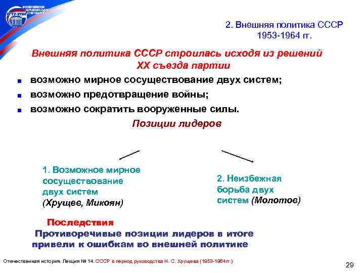 2. Внешняя политика СССР 1953 1964 гг. активизация борьбы СССР за ослабление международной обстановки; проблема разоружения; советско американские отношения; деятельность СССР в ООН; советско японские отношения; десталинизация в странах Восточной Европы; взаимоотношения с Югославией и Албанией; германский вопрос; Карибский кризис. послесталинское руководство проявляло стремление к динамизму во внешней политике. Отечественная история. Лекция № 14. СССР в период руководства Н. С. Хрущева (1953 1964 гг. ) 28