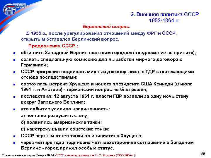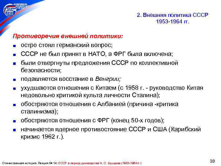 2. Внешняя политика СССР 1953 1964 гг. Противоречия внешней политики: остро стоял германский вопрос; СССР не был принят в НАТО, а ФРГ была включена; были отвергнуты предложения СССР по коллективной безопасности; подавляется восстание в Венгрии; ухудшаются отношения с Китаем (с 1958 г. руководство Китая недовольно критикой культа личности Сталина); обостряются отношения с Албанией (причина критика сталинизма); обостряются отношения с ФРГ (конец 50 х годов); начинается ядерное противостояние СССР и США (Карибский кризис 1962 г. ). Отечественная история. Лекция № 14. СССР в период руководства Н. С. Хрущева (1953 1964 гг. ) 38