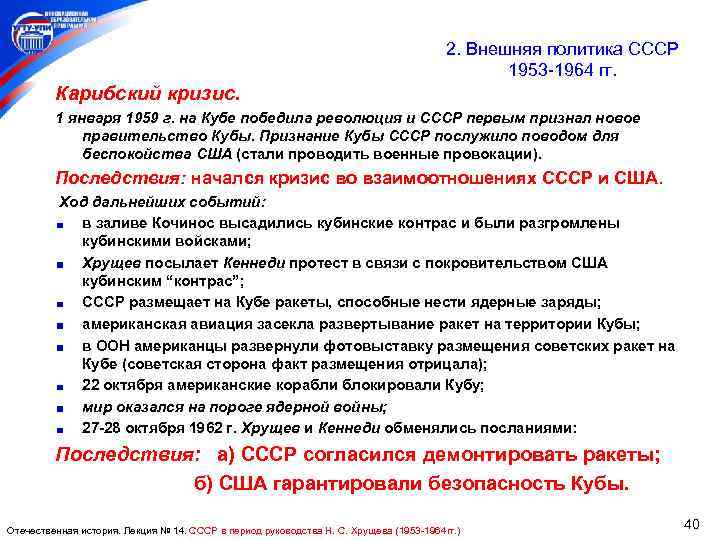 2. Внешняя политика СССР 1953 1964 гг. Карибский кризис. 1 января 1959 г. на Кубе победила революция и СССР первым признал новое правительство Кубы. Признание Кубы СССР послужило поводом для беспокойства США (стали проводить военные провокации). Последствия: начался кризис во взаимоотношениях СССР и США. Ход дальнейших событий: в заливе Кочинос высадились кубинские контрас и были разгромлены кубинскими войсками; Хрущев посылает Кеннеди протест в связи с покровительством США кубинским “контрас”; СССР размещает на Кубе ракеты, способные нести ядерные заряды; американская авиация засекла развертывание ракет на территории Кубы; в ООН американцы развернули фотовыставку размещения советских ракет на Кубе (советская сторона факт размещения отрицала); 22 октября американские корабли блокировали Кубу; мир оказался на пороге ядерной войны; 27 28 октября 1962 г. Хрущев и Кеннеди обменялись посланиями: Последствия: а) СССР согласился демонтировать ракеты; б) США гарантировали безопасность Кубы. Отечественная история. Лекция № 14. СССР в период руководства Н. С. Хрущева (1953 1964 гг. ) 40