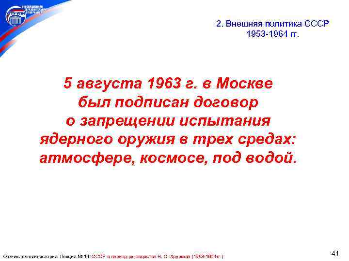 2. Внешняя политика СССР 1953 1964 гг. 5 августа 1963 г. в Москве был подписан договор о запрещении испытания ядерного оружия в трех средах: атмосфере, космосе, под водой. Отечественная история. Лекция № 14. СССР в период руководства Н. С. Хрущева (1953 1964 гг. ) 41