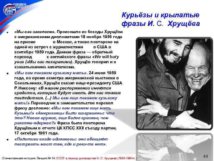 Курьёзы и крылатые фразы И. С. Хрущёва «Мы вас закопаем» . Произошло из беседы Хрущёва с американскими дипломатами 18 ноября 1956 года на приеме в Москве, а также повторено на одной из встреч с журналистами в США в сентябре 1959 года. Данная фраза — обратный перевод с английского фразы «We will bury you» ( «Мы вас похороним» ). Хрущёв говорил и о «закапывании» капитализма. «Мы вам покажем кузькину мать» . 24 июня 1959 года, во время осмотра американской выставки в Сокольниках, Хрущёв сказал вице президенту США Р. Никсону: «В нашем распоряжении имеются средства, которые будут иметь для вас тяжкие последствия. (. . . ) Мы вам еще покажем кузькину мать!» Переводчик в замешательстве перевел фразу дословно: «Мы вам покажем еще мать Кузьмы!» «Американцы были ошарашены: что это? Новое оружие, еще более грозное, чем ракетно ядерное? » Фраза была повторена Хрущёвым в отчете ЦК КПСС XXII съезду партии, 17 октября 1961 года. «Политики везде одинаковы: они обещают построить мост там, где и реки то нет» . Отечественная история. Лекция № 14. СССР в период руководства Н. С. Хрущева (1953 1964 гг. ) 44