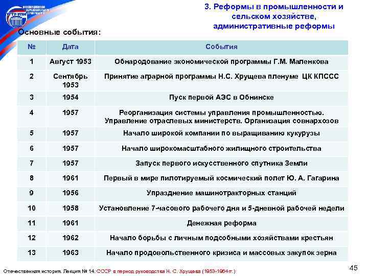 Основные события: 3. Реформы в промышленности и сельском хозяйстве, административные реформы № Дата События 1 Август 1953 Обнародование экономической программы Г. М. Маленкова 2 Сентябрь 1953 Принятие аграрной программы Н. С. Хрущева пленуме ЦК КПССС 3 1954 Пуск первой АЭС в Обнинске 4 1957 Реорганизация системы управления промышленностью. Управление отраслевых министерств. Организация совнархозов 5 1957 Начало широкой компании по выращиванию кукурузы 6 1957 Начало широкомасштабного жилищного строительства 7 1957 Запуск первого искусственного спутника Земли 8 1961 Первый в мире пилотируемый космический полет Ю. А. Гагарина 9 1956 Упразднение машинотракторных станций 10 1958 Установление 7 часового рабочего дня и 5 дневной рабочей недели 11 1961 Денежная реформа 12 1962 Начало борьбы с личным подсобными хозяйствами крестьян 13 1963 Начало продовольственного кризиса и массовых закупок зерна Отечественная история. Лекция № 14. СССР в период руководства Н. С. Хрущева (1953 1964 гг. ) 45