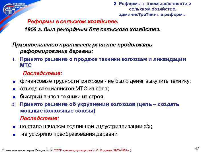 3. Реформы в промышленности и сельском хозяйстве, административные реформы На XXI съезде КПСС (январь 1959 г. ) было принято решение заменить пятилетний план семилетним. В плане был сделан акцент на улучшение жизни народа: обеспечение населения жильем; продуктами потребления; развитие легкой промышленности. На съезде была поставлена задача догнать развитые капиталис тические страны по производству продукции на душу населения Съезд стал точкой отсчета неточного прогноза развития СССР В 1958 1965 гг. были увеличены капиталовложения и кредиты которые значительно превышали возможности бюджета Последствия неконтролируемый рост промышленности группы «А» текучесть кадров; снижение темпов экономического роста; увеличение дефицита. Отечественная история. Лекция № 14. СССР в период руководства Н. С. Хрущева (1953 1964 гг. ) 46