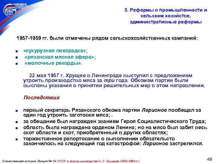 3. Реформы в промышленности и сельском хозяйстве, административные реформы 1957 1959 гг. были отмечены рядом сельскохозяйственных кампаний: «кукурузная лихорадка» ; «рязанская мясная афера» ; «молочные рекорды» . 22 мая 1957 г. Хрущев в Ленинграде выступил с предложением утроить производство мяса за три года. Обкомам партии были высланы указания о принятии решительных мер в этом направлении. Последствия первый секретарь Рязанского обкома партии Ларионов пообещал за один год утроить заготовки мяса; . за обещание был награжден званием Героя Социалистического Труда; область была награждена орденом Ленина; но на мясо был забит весь скот области и скот, приобретенный в других областях; торжественное рапортование о выполнении обязательств закончилось на следующий год катастрофой: Ларионов застрелился. Отечественная история. Лекция № 14. СССР в период руководства Н. С. Хрущева (1953 1964 гг. ) 48