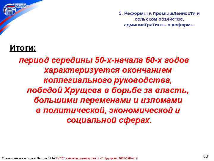3. Реформы в промышленности и сельском хозяйстве, административные реформы Итоги: период середины 50 х начала 60 х годов характеризуется окончанием коллегиального руководства, победой Хрущева в борьбе за власть, большими переменами и изломами в политической, экономической и социальной сферах. Отечественная история. Лекция № 14. СССР в период руководства Н. С. Хрущева (1953 1964 гг. ) 50