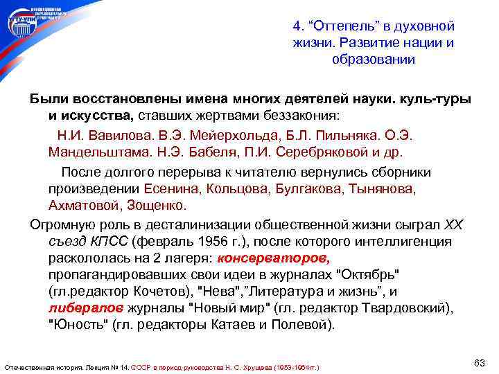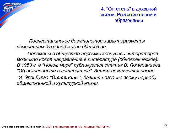 4. “Оттепель” в духовной жизни. Развитие нации и образовании Послесталинское десятилетие характеризуется изменением духовной жизни общества. Перемены в обществе первыми коснулись литераторов. Возникло новое направление в литературе (обновленческое). В 1953 г. в "Новом мире" публикуется статья В. Померанцева "Об искренности в литературе". Затем появляются роман И. Эренбурга "Оттепель ", давший название всему периоду общественной и культурной жизни. Отечественная история. Лекция № 14. СССР в период руководства Н. С. Хрущева (1953 1964 гг. ) 62