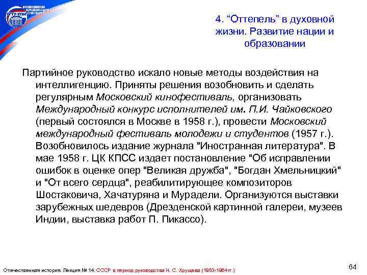 4. “Оттепель” в духовной жизни. Развитие нации и образовании Партийное руководство искало новые методы воздействия на интеллигенцию. Приняты решения возобновить и сделать регулярным Московский кинофестиваль, организовать Международный конкурс исполнителей им. П. И. Чайковского (первый состоялся в Москве в 1958 г. ), провести Московский международный фестиваль молодежи и студентов (1957 г. ). Возобновилось издание журнала "Иностранная литература". В мае 1958 г. ЦК КПСС издает постановление "Об исправлении ошибок в оценке опер "Великая дружба", "Богдан Хмельницкий" и "От всего сердца", реабилитирующее композиторов Шостаковича, Хачатуряна и Мурадели. Организуются выставки зарубежных шедевров (Дрезденской картинной галереи, музеев Индии, выставка работ П. Пикассо). Отечественная история. Лекция № 14. СССР в период руководства Н. С. Хрущева (1953 1964 гг. ) 64