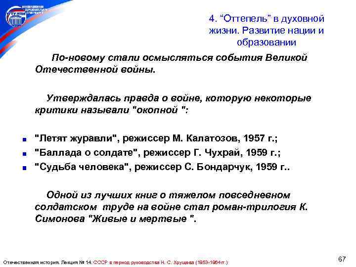4. “Оттепель” в духовной жизни. Развитие нации и образовании По новому стали осмысляться события Великой Отечественной войны. Утверждалась правда о войне, которую некоторые критики называли "окопной ": "Летят журавли", режиссер М. Калатозов, 1957 г. ; "Баллада о солдате", режиссер Г. Чухрай, 1959 г. ; "Судьба человека", режиссер С. Бондарчук, 1959 г. . Одной из лучших книг о тяжелом повседневном солдатском труде на войне стал роман трилогия К. Симонова "Живые и мертвые ". Отечественная история. Лекция № 14. СССР в период руководства Н. С. Хрущева (1953 1964 гг. ) 67