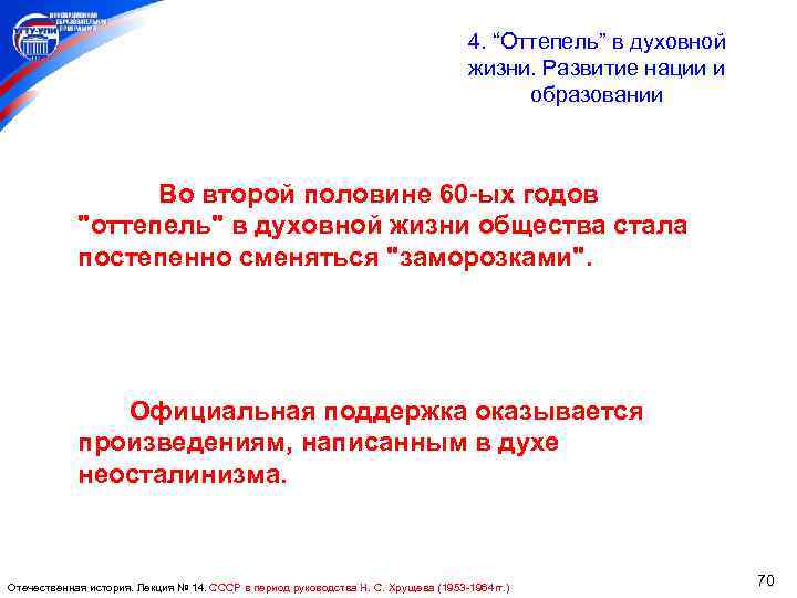 4. “Оттепель” в духовной жизни. Развитие нации и образовании Во второй половине 60 ых годов "оттепель" в духовной жизни общества стала постепенно сменяться "заморозками". Официальная поддержка оказывается произведениям, написанным в духе неосталинизма. Отечественная история. Лекция № 14. СССР в период руководства Н. С. Хрущева (1953 1964 гг. ) 70