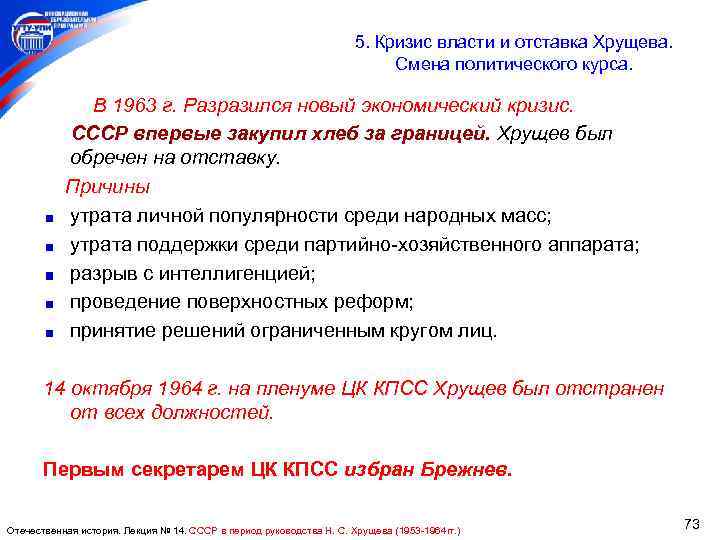 5. Кризис власти и отставка Хрущева. Смена политического курса. В 1963 г. Разразился новый экономический кризис. СССР впервые закупил хлеб за границей. Хрущев был обречен на отставку. Причины утрата личной популярности среди народных масс; утрата поддержки среди партийно хозяйственного аппарата; разрыв с интеллигенцией; проведение поверхностных реформ; принятие решений ограниченным кругом лиц. 14 октября 1964 г. на пленуме ЦК КПСС Хрущев был отстранен от всех должностей. Первым секретарем ЦК КПСС избран Брежнев. Отечественная история. Лекция № 14. СССР в период руководства Н. С. Хрущева (1953 1964 гг. ) 73