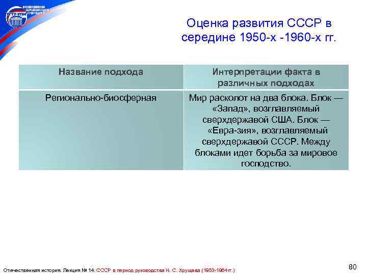 Оценка развития СССР в середине 1950 х 1960 х гг. Название подхода Интерпретации факта в различных подходах Регионально биосферная Мир расколот на два блока. Блок — «Запад» , возглавляемый сверхдержавой США. Блок — «Евра зия» , возглавляемый сверхдержавой СССР. Между блоками идет борьба за мировое господство. Отечественная история. Лекция № 14. СССР в период руководства Н. С. Хрущева (1953 1964 гг. ) 80