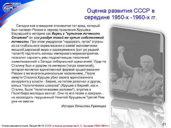 Оценка развития СССР в середине 1950 х 1960 х гг. Сегодня все очевиднее становится тот вред, который был нанесен России в период правления Хрущева. Вошедший в историю как борец с "культом личности Сталина" он сам раздул такой же культ собственной личности. При этом умудрился "надорвать пупок" страны из за глобального соревнования с самой экономически мощной державой мира и одновременно (вот уж редкий талант!) подточить основы имперского мировосприятия, позволил заразить умы подрастающих поколений заимствованной с Запада либеральной идеологией. Удар по Сталину был и ударом по империи (тогда советской), которая является единственной формой существования России с ее многонациональным населением, , После смерти Сталина Хрущев убил своего единственного конкурента у власти Берию, но потом разогнал и других, вялых "политических шакалов" (Хрущев с Берией, как и Сталин, были "политическими волками"), впустив в Политбюро молодых волчат. Они то его позже и сожрали. . . но воссоздать порушенный Никитой Хрущевым Третий Рим уже не смогли. Историк Вячеслав Румянцев Отечественная история. Лекция № 14. СССР в период руководства Н. С. Хрущева (1953 1964 гг. ) 81
