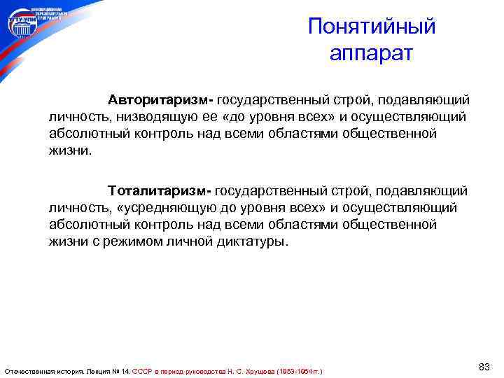 Понятийный аппарат Авторитаризм государственный строй, подавляющий личность, низводящую ее «до уровня всех» и осуществляющий абсолютный контроль над всеми областями общественной жизни. Тоталитаризм государственный строй, подавляющий личность, «усредняющую до уровня всех» и осуществляющий абсолютный контроль над всеми областями общественной жизни с режимом личной диктатуры. Отечественная история. Лекция № 14. СССР в период руководства Н. С. Хрущева (1953 1964 гг. ) 83
