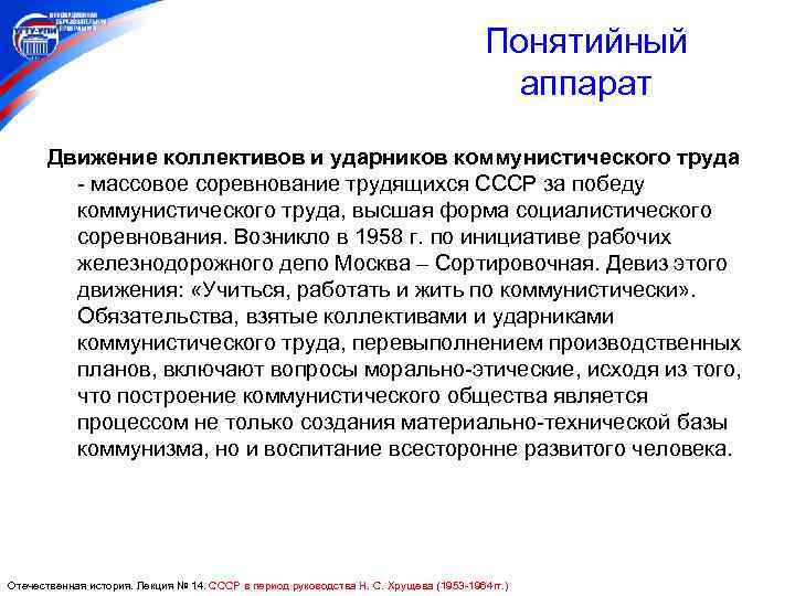 Понятийный аппарат Движение коллективов и ударников коммунистического труда массовое соревнование трудящихся СССР за победу коммунистического труда, высшая форма социалистического соревнования. Возникло в 1958 г. по инициативе рабочих железнодорожного депо Москва – Сортировочная. Девиз этого движения: «Учиться, работать и жить по коммунистически» . Обязательства, взятые коллективами и ударниками коммунистического труда, перевыполнением производственных планов, включают вопросы морально этические, исходя из того, что построение коммунистического общества является процессом не только создания материально технической базы коммунизма, но и воспитание всесторонне развитого человека. Отечественная история. Лекция № 14. СССР в период руководства Н. С. Хрущева (1953 1964 гг. )