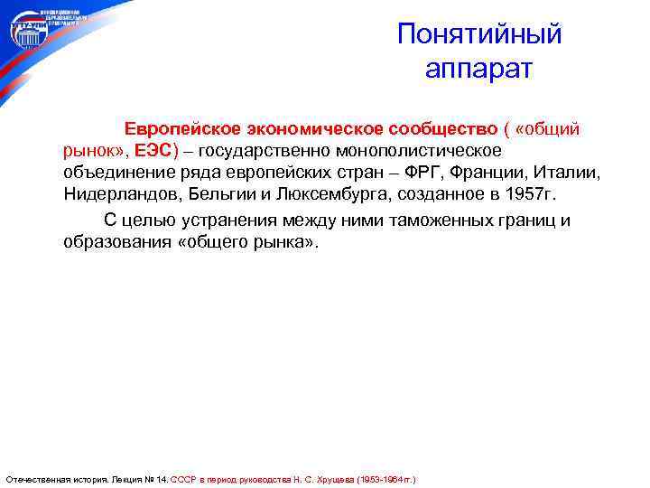 Понятийный аппарат Европейское экономическое сообщество ( «общий рынок» , ЕЭС) – государственно монополистическое объединение ряда европейских стран – ФРГ, Франции, Италии, Нидерландов, Бельгии и Люксембурга, созданное в 1957 г. С целью устранения между ними таможенных границ и образования «общего рынка» . Отечественная история. Лекция № 14. СССР в период руководства Н. С. Хрущева (1953 1964 гг. )