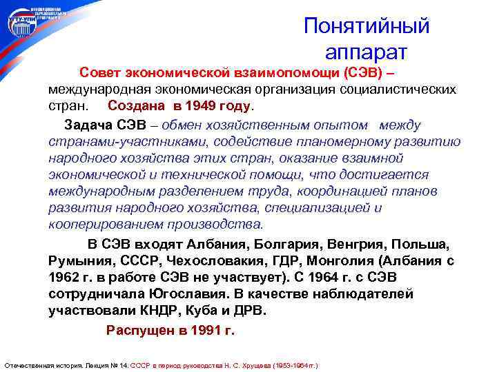 Понятийный аппарат Совет экономической взаимопомощи (СЭВ) – международная экономическая организация социалистических стран. Создана в 1949 году. Задача СЭВ – обмен хозяйственным опытом между странами участниками, содействие планомерному развитию народного хозяйства этих стран, оказание взаимной экономической и технической помощи, что достигается международным разделением труда, координацией планов развития народного хозяйства, специализацией и кооперированием производства. В СЭВ входят Албания, Болгария, Венгрия, Польша, Румыния, СССР, Чехословакия, ГДР, Монголия (Албания с 1962 г. в работе СЭВ не участвует). С 1964 г. с СЭВ сотрудничала Югославия. В качестве наблюдателей участвовали КНДР, Куба и ДРВ. Распущен в 1991 г. Отечественная история. Лекция № 14. СССР в период руководства Н. С. Хрущева (1953 1964 гг. )