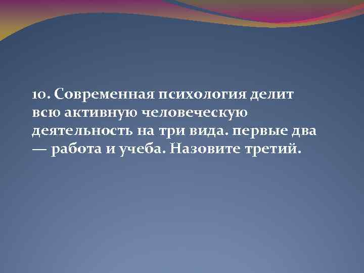 10. Современная психология делит всю активную человеческую деятельность на три вида. первые два — работа и учеба. Назовите третий.