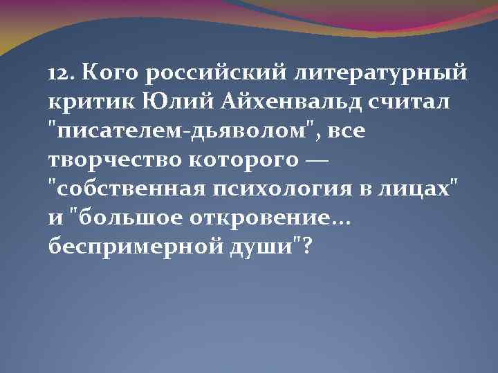 12. Кого российский литературный критик Юлий Айхенвальд считал "писателем-дьяволом", все творчество которого — "собственная психология в лицах" и "большое откровение. . . беспримерной души"?