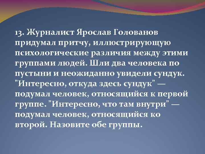 13. Журналист Ярослав Голованов придумал притчу, иллюстрирующую психологические различия между этими группами людей. Шли два человека по пустыни и неожиданно увидели сундук. "Интересно, откуда здесь сундук" — подумал человек, относящийся к первой группе. "Интересно, что там внутри" — подумал человек, относящийся ко второй. Назовите обе группы.