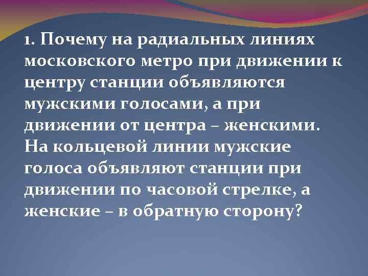 1. Почему на радиальных линиях московского метро при движении к центру станции объявляются мужскими голосами, а при движении от центра – женскими. На кольцевой линии мужские голоса объявляют станции при движении по часовой стрелке, а женские – в обратную сторону?