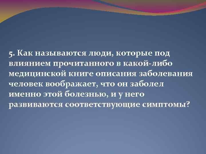 5. Как называются люди, которые под влиянием прочитанного в какой-либо медицинской книге описания заболевания человек воображает, что он заболел именно этой болезнью, и у него развиваются соответствующие симптомы?