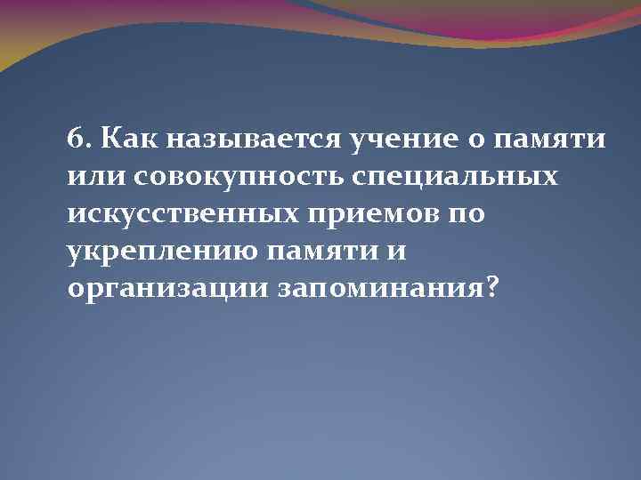 6. Как называется учение о памяти или совокупность специальных искусственных приемов по укреплению памяти и организации запоминания?