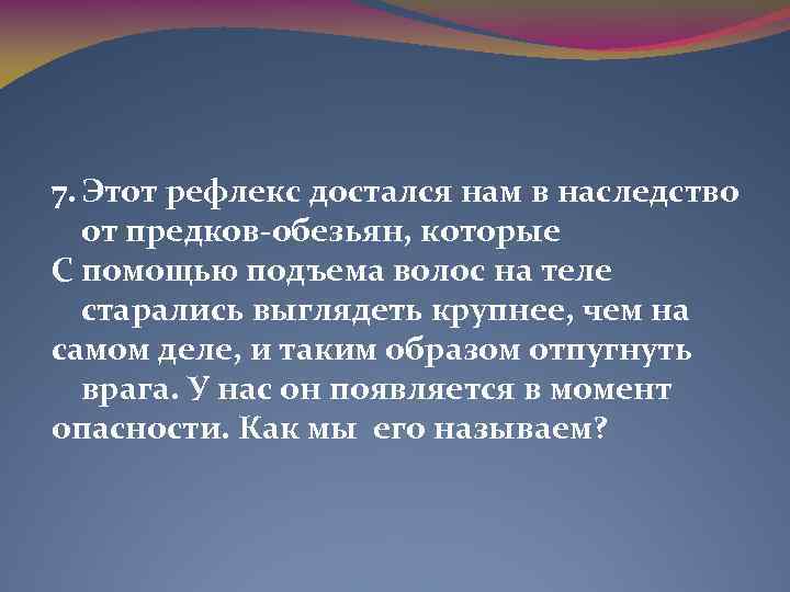 7. Этот рефлекс достался нам в наследство от предков-обезьян, которые С помощью подъема волос на теле старались выглядеть крупнее, чем на самом деле, и таким образом отпугнуть врага. У нас он появляется в момент опасности. Как мы его называем?