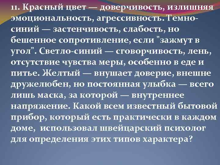 11. Красный цвет — доверчивость, излишняя эмоциональность, агрессивность. Темносиний — застенчивость, слабость, но бешенное сопротивление, если "зажмут в угол". Светло-синий — сговорчивость, лень, отсутствие чувства меры, особенно в еде и питье. Желтый — внушает доверие, внешне дружелюбен, но постоянная улыбка — всего лишь маска, за которой — внутреннее напряжение. Какой всем известный бытовой прибор, который есть практически в каждом доме, использовал швейцарский психолог для определения этих типов характера?