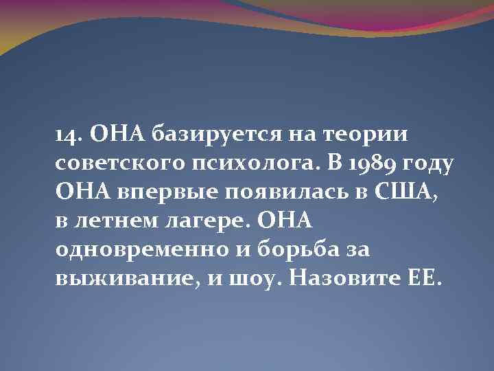 14. ОНА базируется на теории советского психолога. В 1989 году ОНА впервые появилась в США, в летнем лагере. ОНА одновременно и борьба за выживание, и шоу. Назовите ЕЕ.