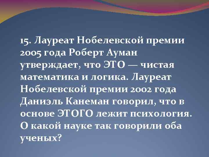 15. Лауреат Нобелевской премии 2005 года Роберт Ауман утверждает, что ЭТО — чистая математика и логика. Лауреат Нобелевской премии 2002 года Даниэль Канеман говорил, что в основе ЭТОГО лежит психология. О какой науке так говорили оба ученых?