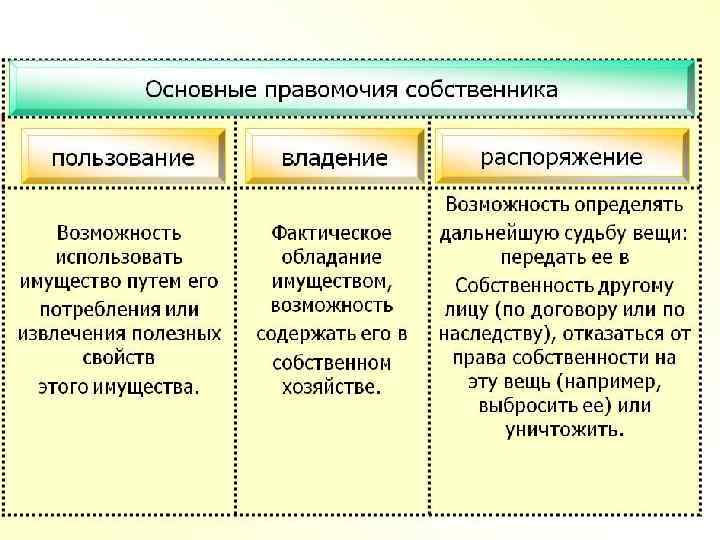 в субъективном смысле совокупность всех правомочий собственника: Владение – фактическое обладание земельным участком; Пользование – извлечение полезных свойств от использования земельного участка; Распоряжение – определение дальнейшей судьбы вещи в объективном смысле совокупность правовых норм, регулирующих общественные отношения, складывающиеся при возникновении, изменении и прекращении права собственности на землю; устанавливающих основания предоставления земельных участков на праве собственности, условия распоряжения ими и т. д.