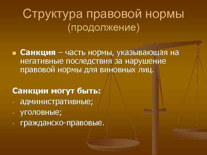 Структура правовой нормы (продолжение) n Санкция – часть нормы, указывающая на негативные последствия за нарушение правовой нормы для виновных лиц. Санкции могут быть: - административные; - уголовные; - гражданско-правовые.